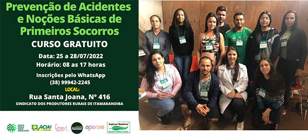 Dia 25 de Julho também realizamos parceria com o SENAR e Sindicato dos Rurais de Itamarandiba com o Apoio da Aperam Bioenergia o curso de Prevenção de acidentes e noções básicas de Primeiros Socorros. O curso teve início dia 25/07/2022 e foi até o dia 28/07/2022.
